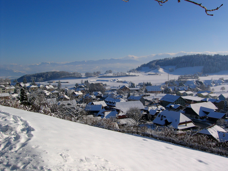verschneites Riggisberg vom "Churchhill" aus gesehen 13.12.2008