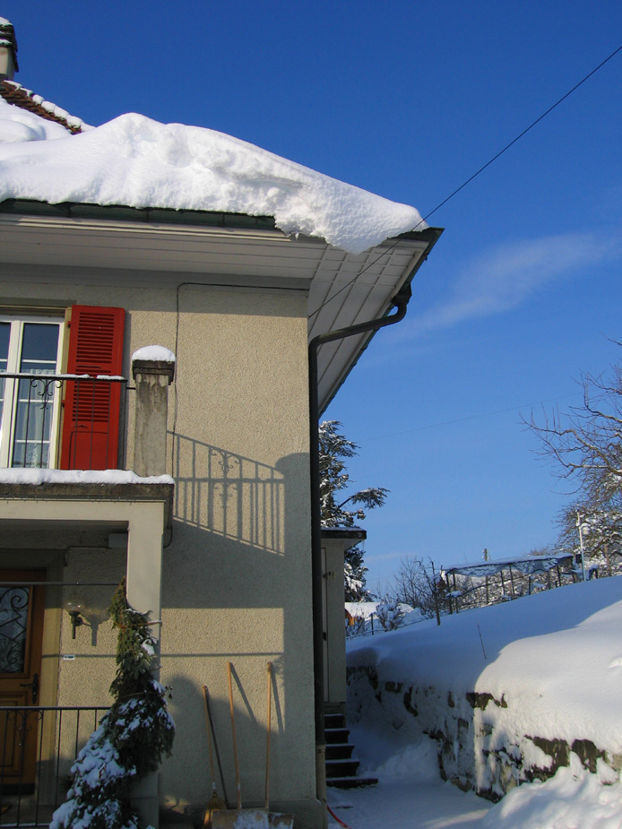 stolze Schneewechte auf dem Dach des Hauses 7. März 2009
