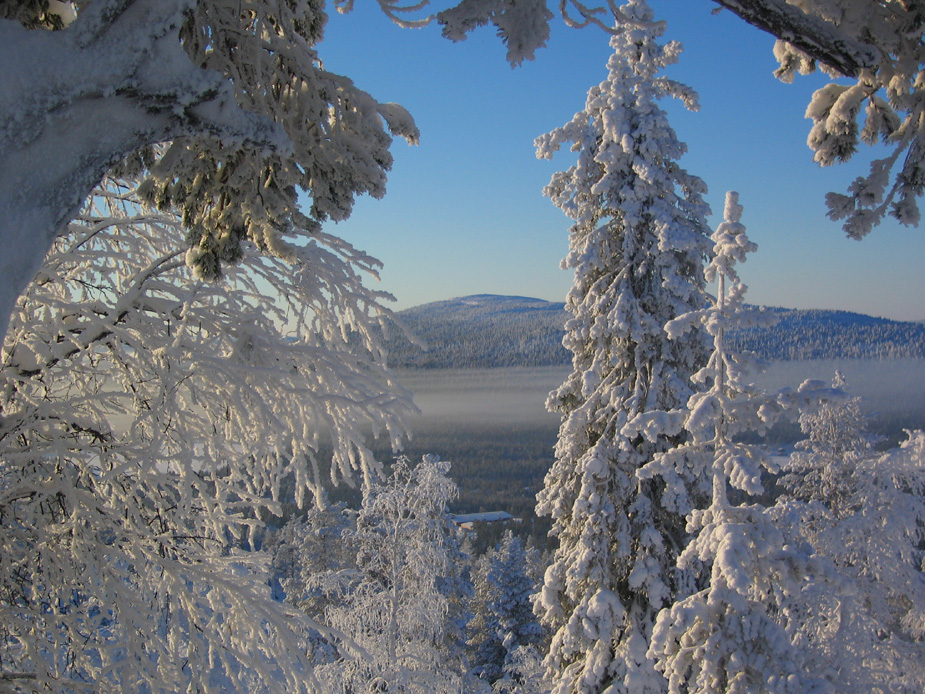 Blick auf den verschneiten "Kätkätunturi" über der bodennahen Inversion