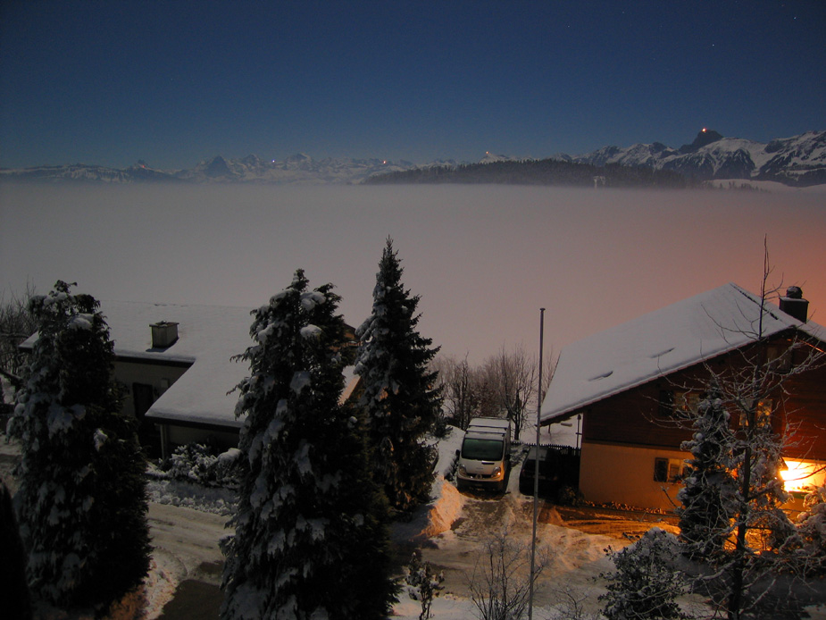 Vollmondnacht über dem Nebelmeer bei -10 °C kurz vor Mitternacht auf den 11. Januar 2009