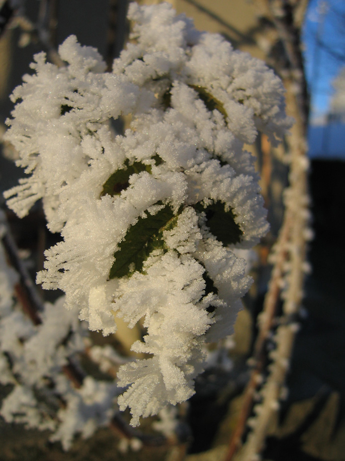 schöne Eisskulpturen an einem Rosenblatt 10. Januar 2006
